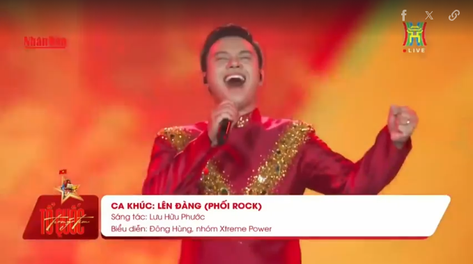 Ca sĩ Đông Hùng hát ''Lên đàng'' với bản phối mới, âm hưởng rock sôi động, thu hút hàng chục nghìn khán giả trẻ hòa điệu, ở concert ''Tổ quốc trong tim'' do báo Nhân Dân tổ chức ngày 10/8, tại Hà Nội. Video: Đài Hà Nội HTV